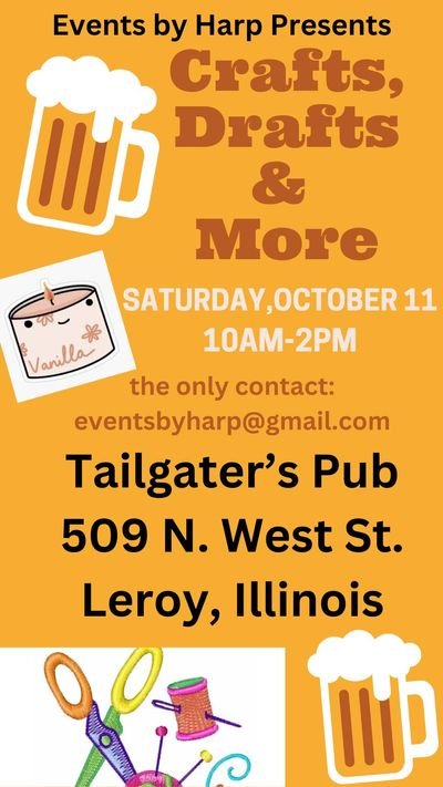 TailGaters Pub is hosting the 3rd Annual Crafts, Drafts & More Fall Show Saturday, October 11, 2025, from 10:00 am to 2:00 pm. Vendors will be selling their wares to help you pick out that hard to find gift for that special someone on your list and get your Christmas shopping done early! The kitchen will be open during the event with a limited menu. Interested vendors should contact eventsbyharp@gmail.com